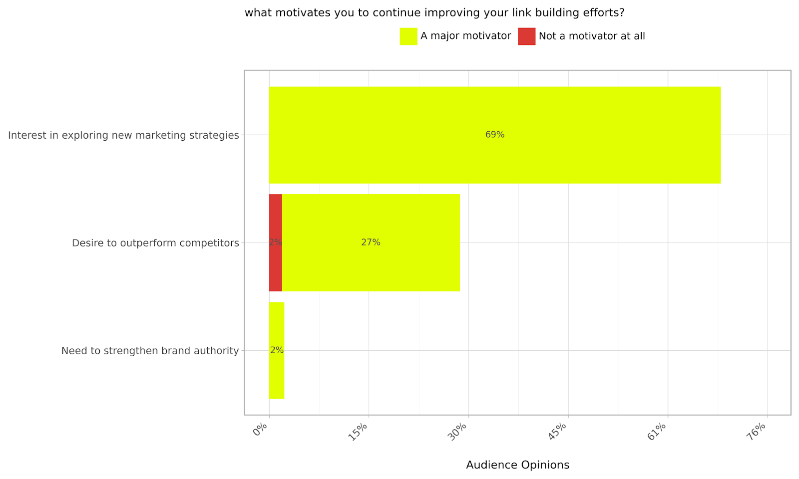 Stagnating is never a smart move in a fast-evolving sector like digital marketing, and US SaaS companies know this. 69% of our audience says that an interest in exploring new marketing strategies is a major motivator for continuing to improve their link building efforts, while 27% feel the same about the desire to outperform competitors, and 2% needing to strengthen brand authority.