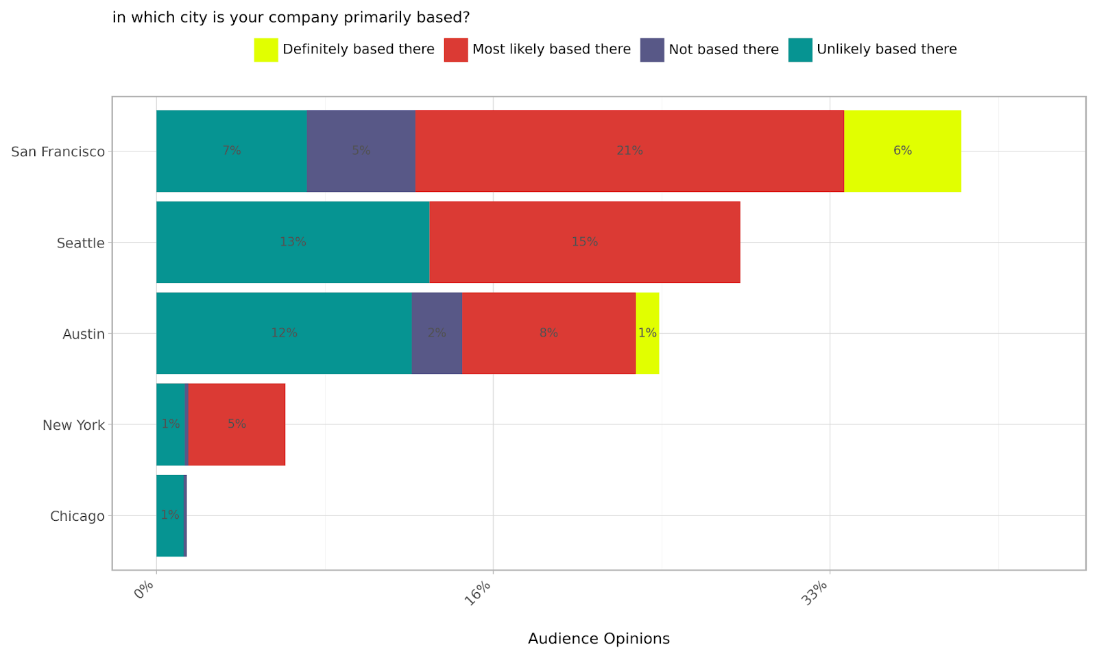 Auston, another growing tech hub, is third, with 1% definitely based there, 8% most likely, 12% unlikely to be, and 2% not based there. This is followed by New York, with 5% most likely based there, and 1% unlikely to be, and Chicago, with 1% also unlikely to be based there. This distribution reveals a clear preference for West Coast tech hubs that boast strong startup ecosystems, access to venture capital, and proximity to established technology networks that foster innovation and growth.