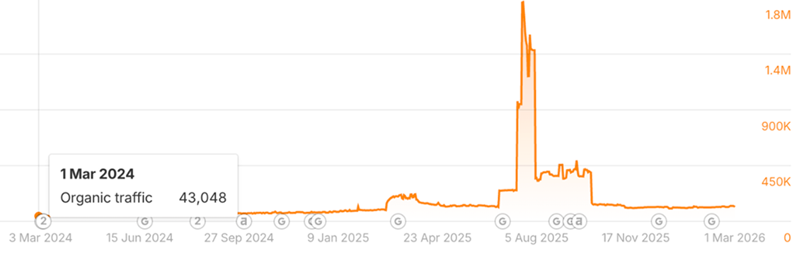 Organic traffic has grown from ~43K to ~120K monthly visits and continues to increase. That’s a 2.8x improvement so far, driven by consistent link building over time.